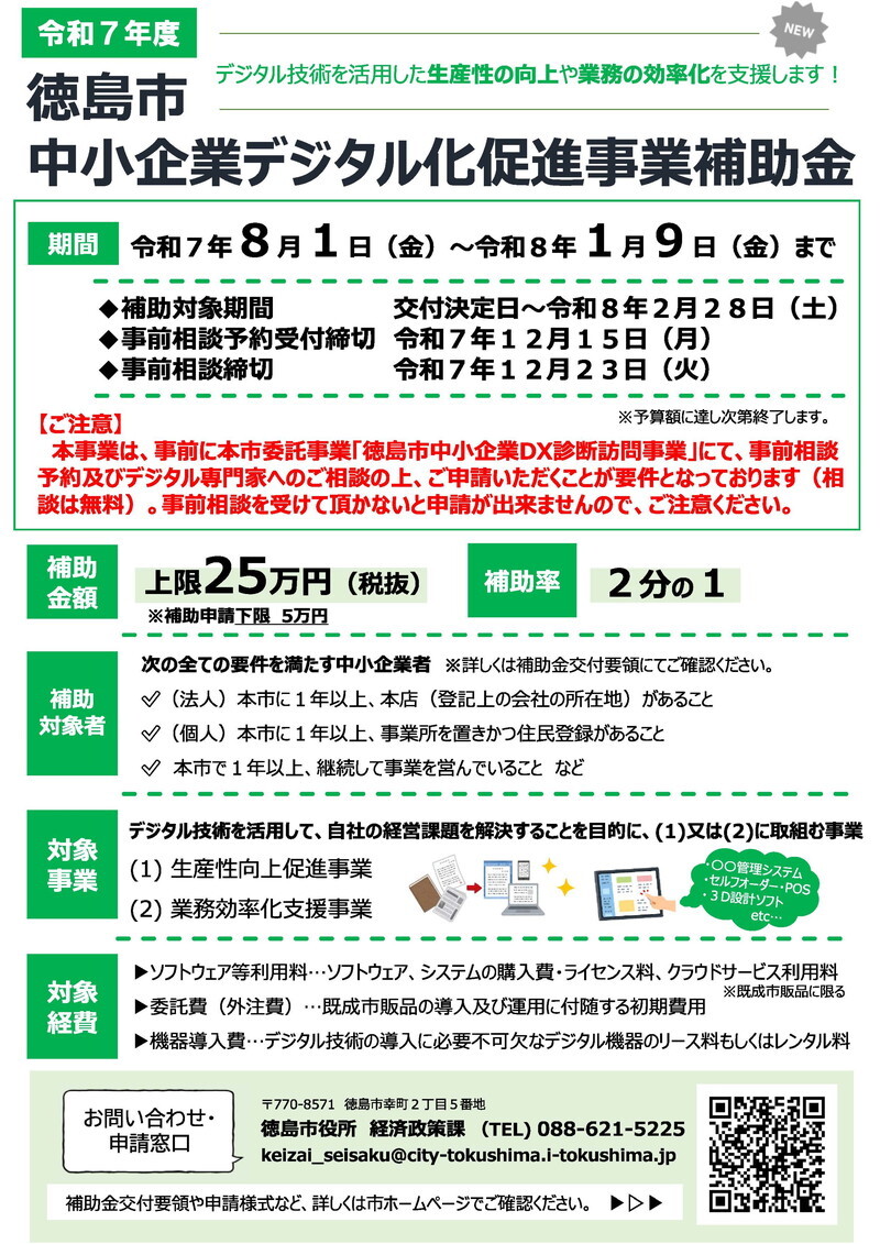 徳島市では、中小企業のデジタル活用による生産性向上・業務効率化を応援する補助金制度があります。